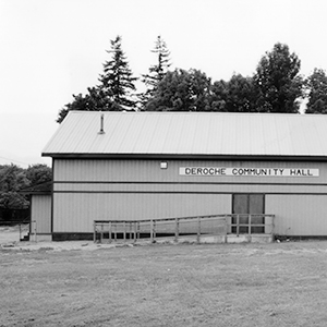The first non-native settlers called the place ‘North Nicomen’, but in 1891 a post office was put in, and Deroche became the official name. The early CPR station, Nicomen, was half a mile west of today’s Deroche, and the CPR had a gravel quarry close beside it. Deroche village itself had no railway stop at all until 1911, when a large sawmill operated close to Nicomen Slough. By the 1920s Deroche had a flourishing main street, with a school, hall, general store and three churches. Today most of these buildings are gone, and Deroche is little more than a quaint village on a busy highway.